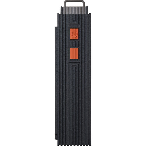 - Slim black design, with a subtle orange accent
