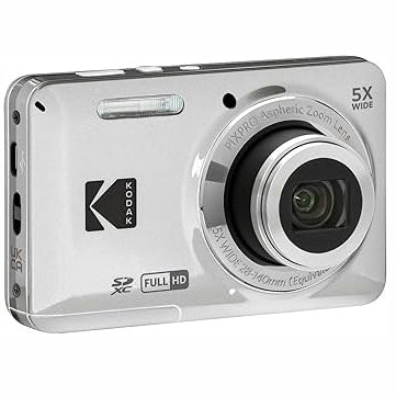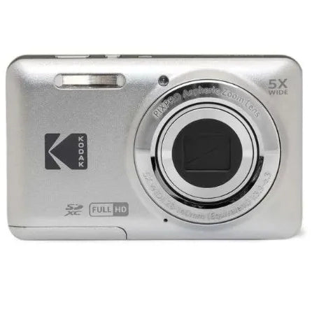 The Kodak PIXPRO FZ55 Digital Camera in red is a small and easy-to-use Friendly Zoom camera from the Kodak PIXPRO collection. This point-and-shoot camera features a 28mm wide-angle lens with a 16MP 1/2.3" CMOS sensor and 2.7" LCD screen. The PIXPRO FZ55 has multiple flash and shooting modes along with a variety of detection features, including face and smile detection. The PIXPRO FZ55 is powered by a rechargeable lithium-ion battery that can be charged inside the camera.